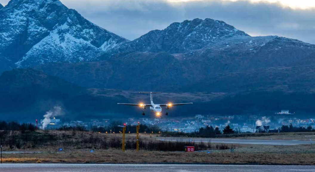 Flyplassrullebane med skilt 02-20 A, omgitt av norsk fjellandskap og grønne daler under overskyet himmel.